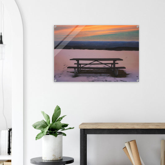Snow & Bench Acrylic Print Winter Mountain Wall Art Home Office Business Commercial Decor Pixio.Co